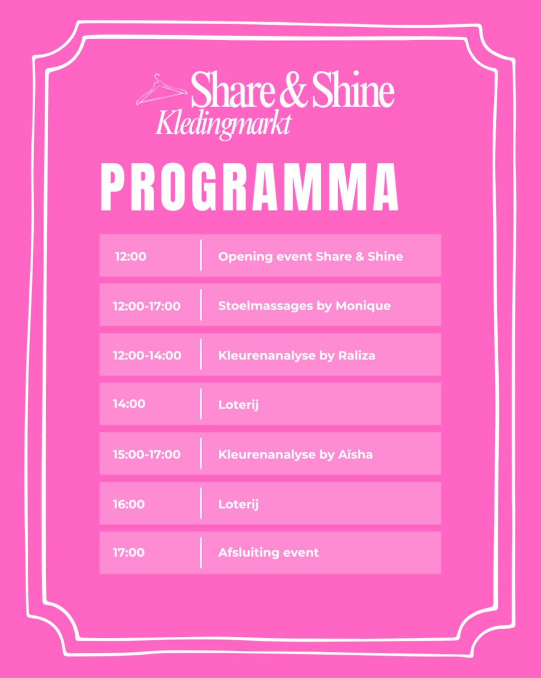 Shine for Women organiseert het Share & Shine event en zet zich volledig in om er een bijzondere dag van te maken. Met liefde voor mode, duurzaamheid en verbinding creëren wij een plek waar vrouwen kunnen shoppen, ontdekken en stralen. Tegelijkertijd ondersteunen we Stichting Voor Jou, zodat alle opbrengsten bijdragen aan ontspanningsweekenden voor vrouwen met kanker. Ons doel is een warm, inspirerend en betekenisvol event neer te zetten waar plezier en impact hand in hand gaan.
